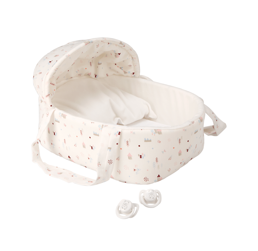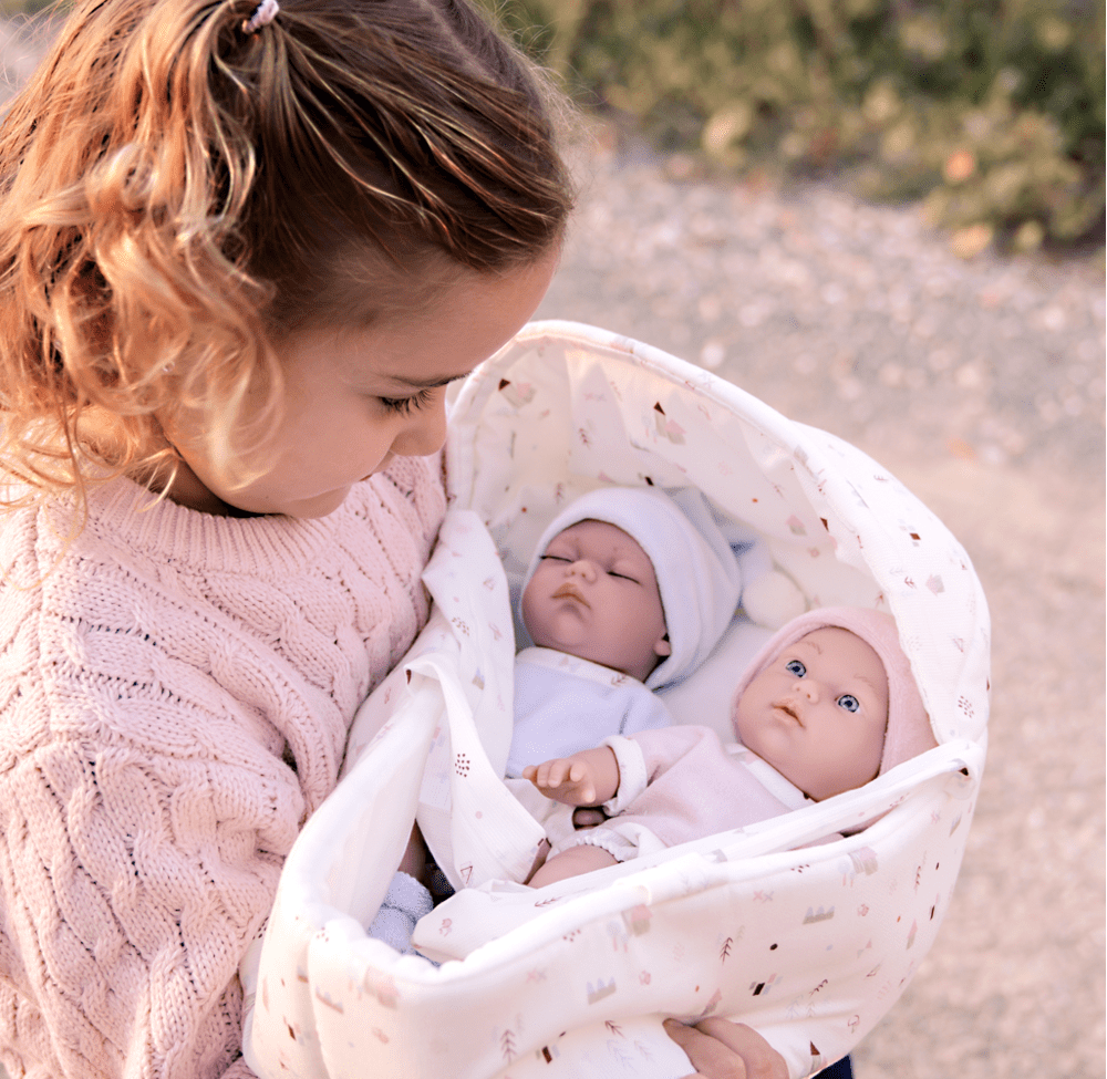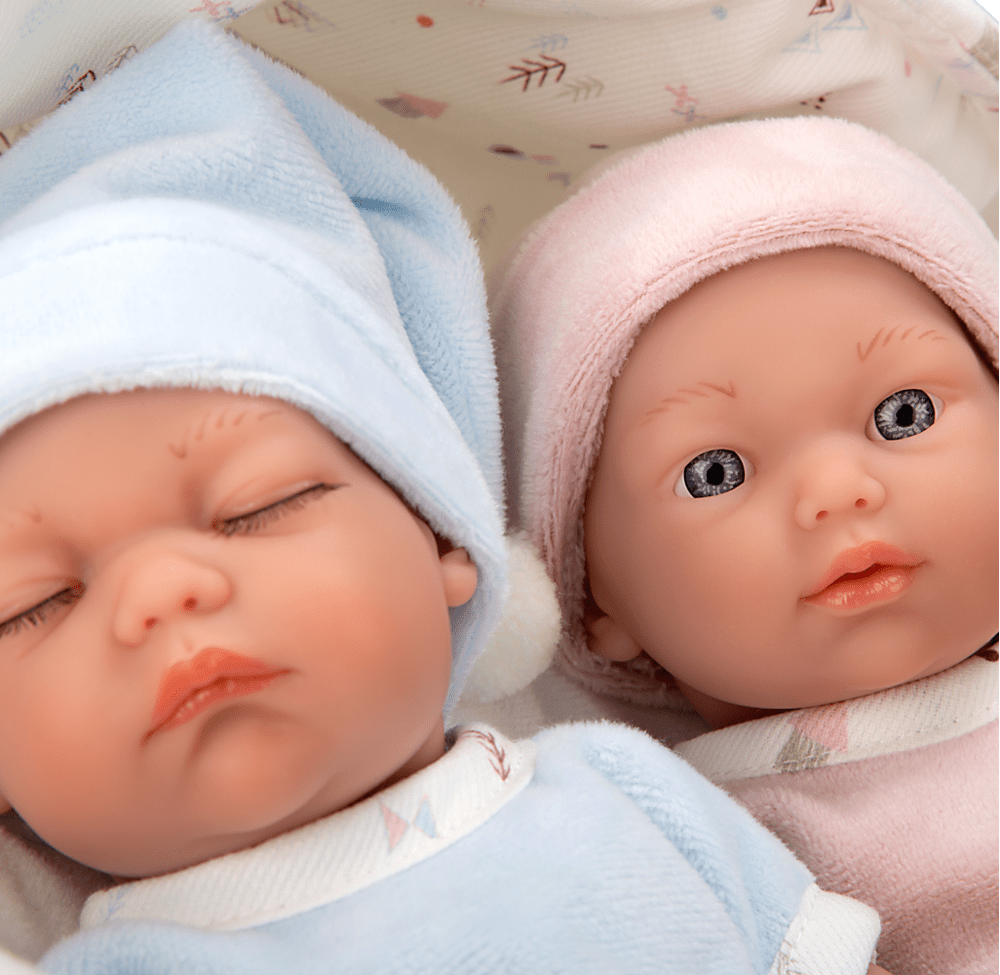 - Komplekt sisaldab: kahte võluvat beebinukku, üks sinises ja teine roosas riietatud, ning armsa mustriga kaunistatud kandekotti.