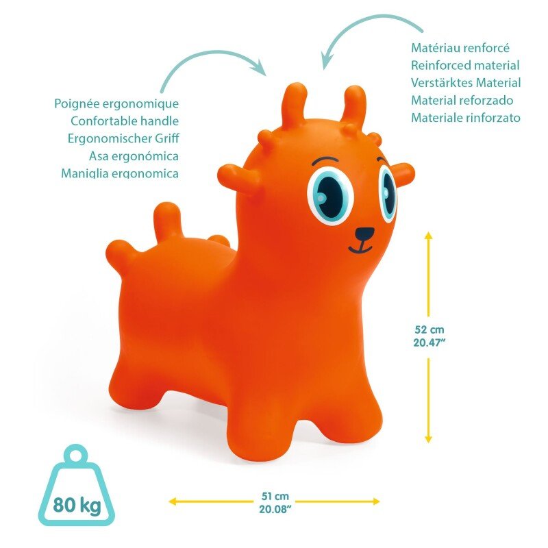 Sunny Jumper on armas kosmosehüppaja. Väga kindel ja mitme kinnihoidmise kohaga: sobib eriti hästi noorematele lastele. Suurepärane sees ja väljas mängimiseks. Komplekti kuulub 1 PVC kosmosehüppaja (52 x 51 cm x 25 cm / 1,500 g) ja 1 pump. Reguleeritav: puhuge kosmosehüppaja olenevalt lapse suurusest rohkem või vähem täis. Kasutaja maks. kaal: 80 kg. Sobib 2- kuni 6-aastastele lastele.