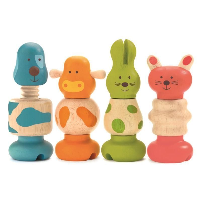 See on värviline puidust kruvidega loomade komplekt. Mängu detailidest saab luua neli looma – lehma, küüliku, kassi ja koera – kuid neib saab ka omavahel segada ning leiutada täiesti uusi loomi. See armas mäng arendab laste tähelepanuvõimet, peenmotoorikat ja võib saada armsaks kingituseks igale väiksemale.