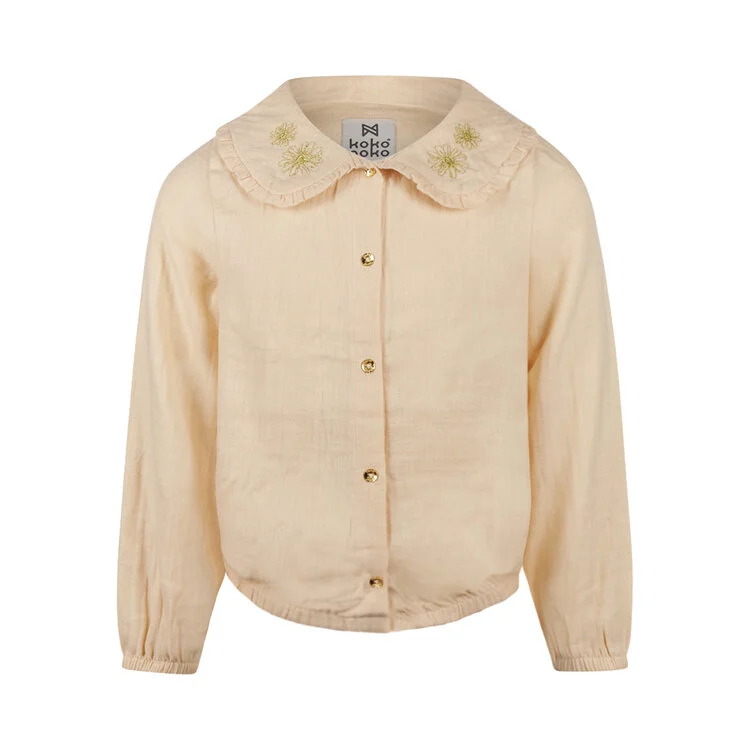 See valkjas Koko Noko pluus on iga tüdruku unistus! Krae ja tikitud lilled annavad särgile lummava ja romantilise ilme. Kuldsed nööbid lisavad luksust, samas kui varrukatel ja alläärel olevad elastsed ribad tagavad ideaalse istuvuse. Pehmest musliinkangast valmistatud tüdrukute pluus pakub lisaks stiilile ka mugavust igaks seikluseks.