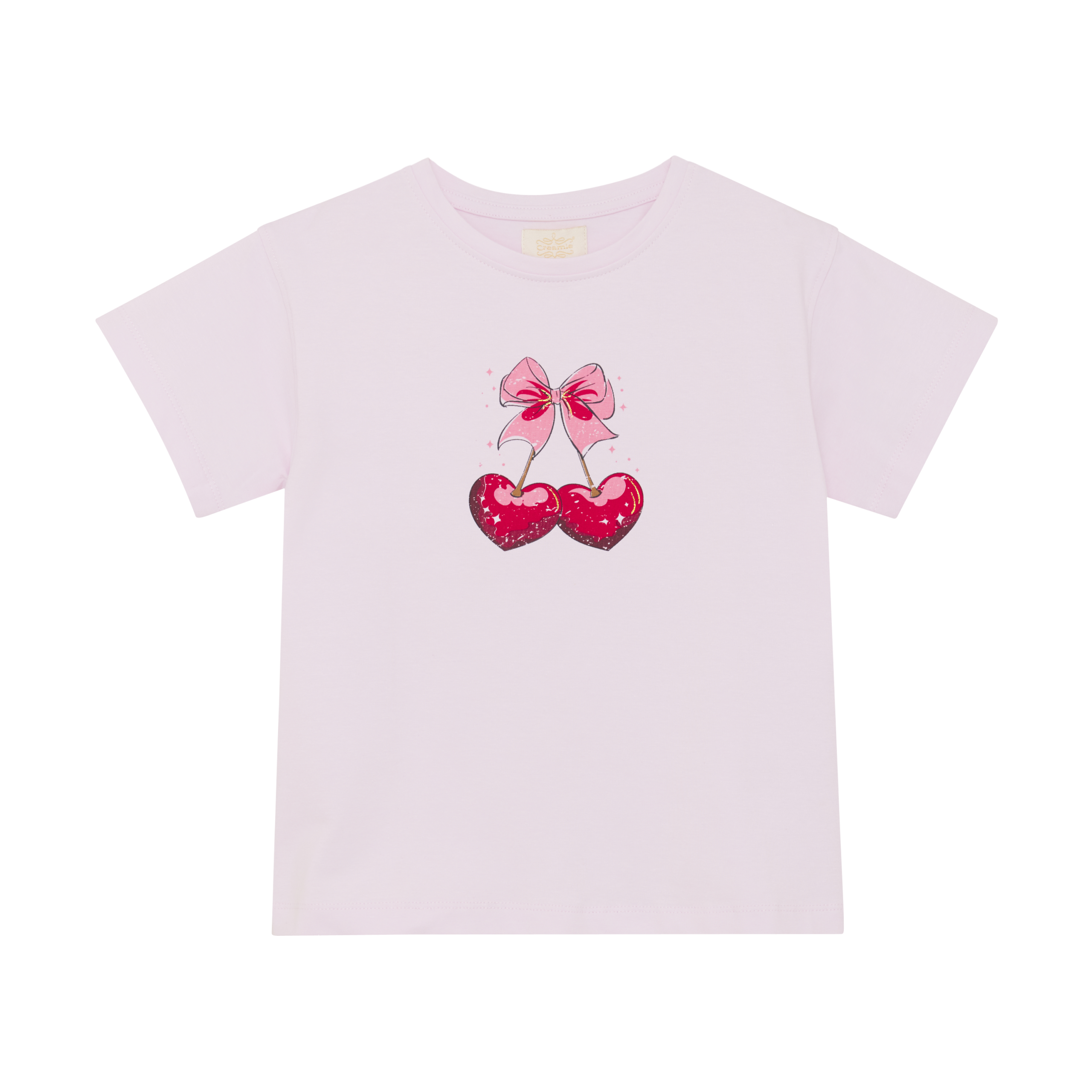 Laste roosa lühikeste varrukatega T-särk lipsu ja kirsimustriga. Sertifitseeritud vastavalt GOTS orgaanilisele CERES-0366 standardile.