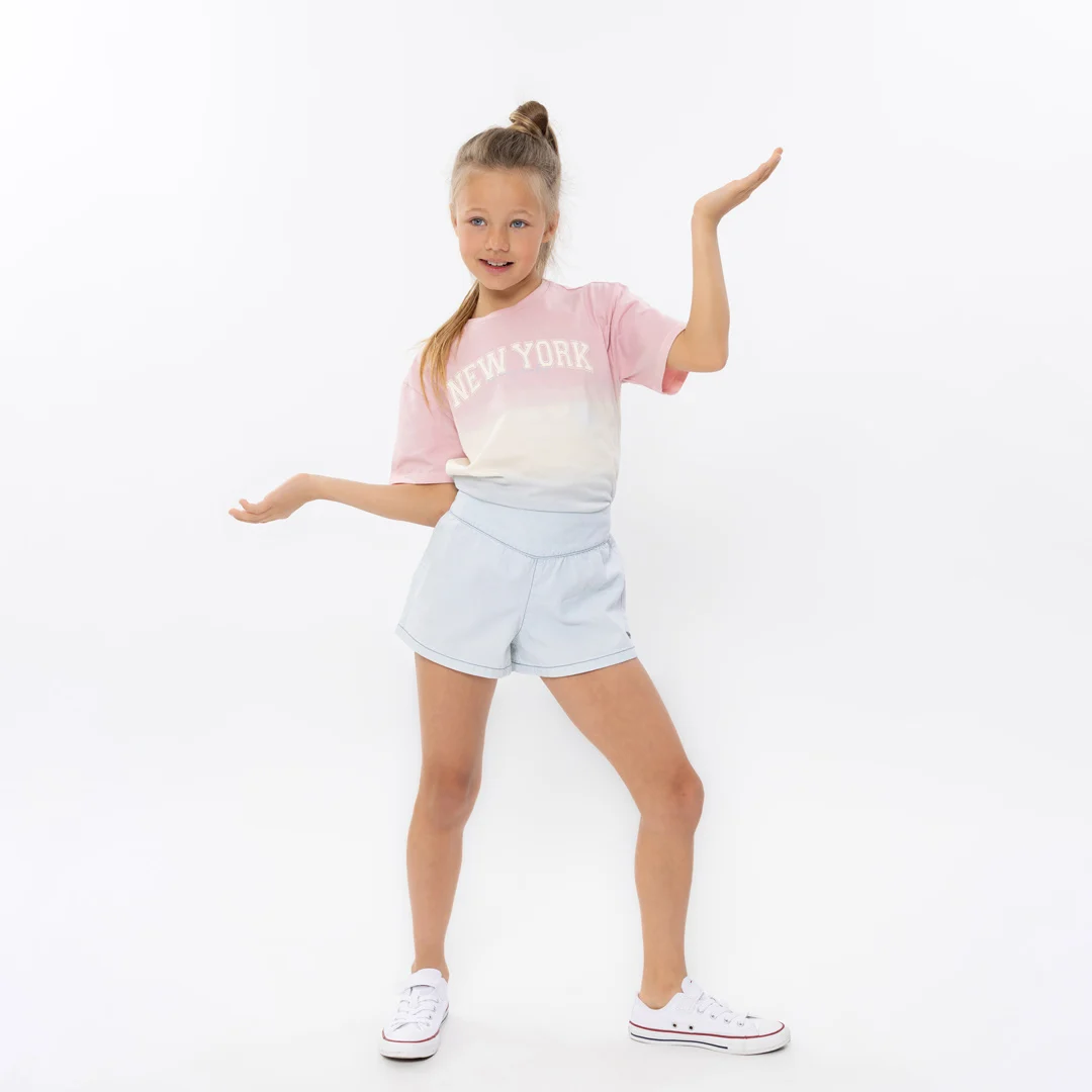 Tüdrukute hallikasroosa t-särk New York kirjaga.
