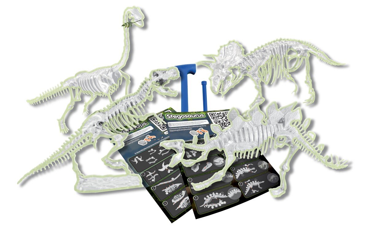 Komplekt sisaldab 4 blokki dinoosauruste fossiilide väljakaevamiseks! Komplektis: veebipõhine haridusraamat, juhend, 4 fossiiliplokki (Türannosaurus rex, Stegosaurus, Brachiosaurus ja Tritseeratops), peitel ja haamer.