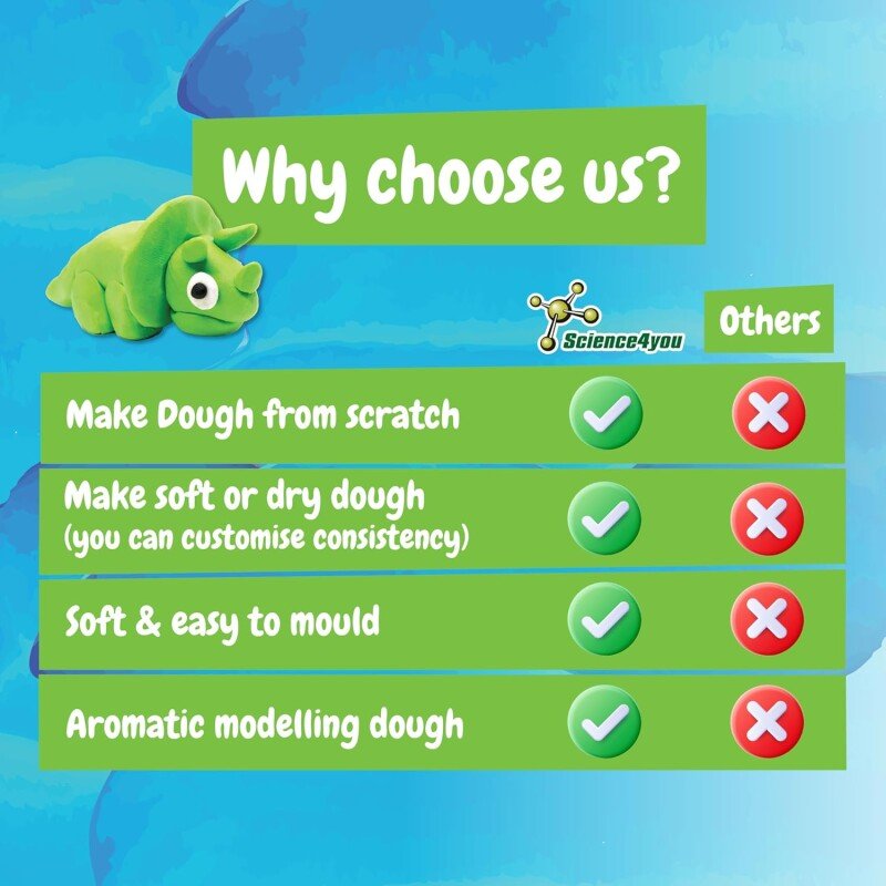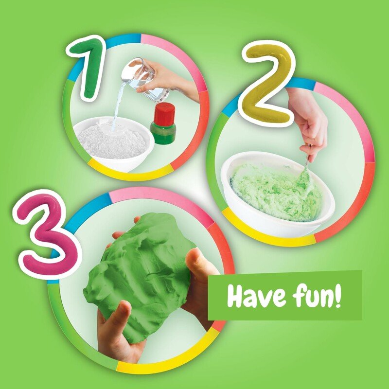 1. Vala segu kotist kaussi. 2. Mõõda 50 milliliitrit (ml) kuuma vett klaasi, lisa kõik värvained ja sega. 3. Lisa aeglaselt värviline vesi ja 10 ml toiduõli segule, segades kahvliga seni, kuni tainas hakkab kokku hoidma. 4. Seejärel pane (soovi korral) kindad kätte ja sõtku tainast kätega. Kui tainas enam ei kleepu, aseta see puhtale pinnale ja sõtku vähemalt 2 minutit, kuni see on sile ja ühtlane. Kui su tainas on ära kuivanud, pane natuke vett või õli kätele ja sõtku seda seni, kuni see muutub taas pehmeks ja venivaks! Valmistatud Portugalis.
