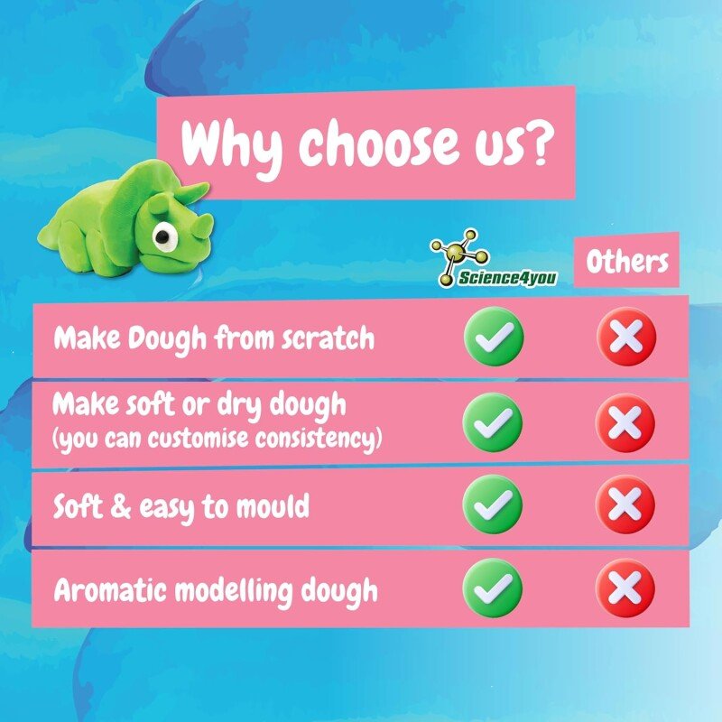 1. Vala segu kotist kaussi. 2. Mõõda 50 milliliitrit (ml) kuuma vett klaasi, lisa kõik värvained ja sega. 3. Lisa aeglaselt värviline vesi ja 10 ml toiduõli segule, segades kahvliga seni, kuni tainas hakkab kokku hoidma. 4. Seejärel pane (soovi korral) kindad kätte ja sõtku tainast kätega. Kui tainas enam ei kleepu, aseta see puhtale pinnale ja sõtku vähemalt 2 minutit, kuni see on sile ja ühtlane. Kui su tainas on ära kuivanud, pane natuke vett või õli kätele ja sõtku seda seni, kuni see muutub taas pehmeks ja venivaks! Valmistatud Portugalis.