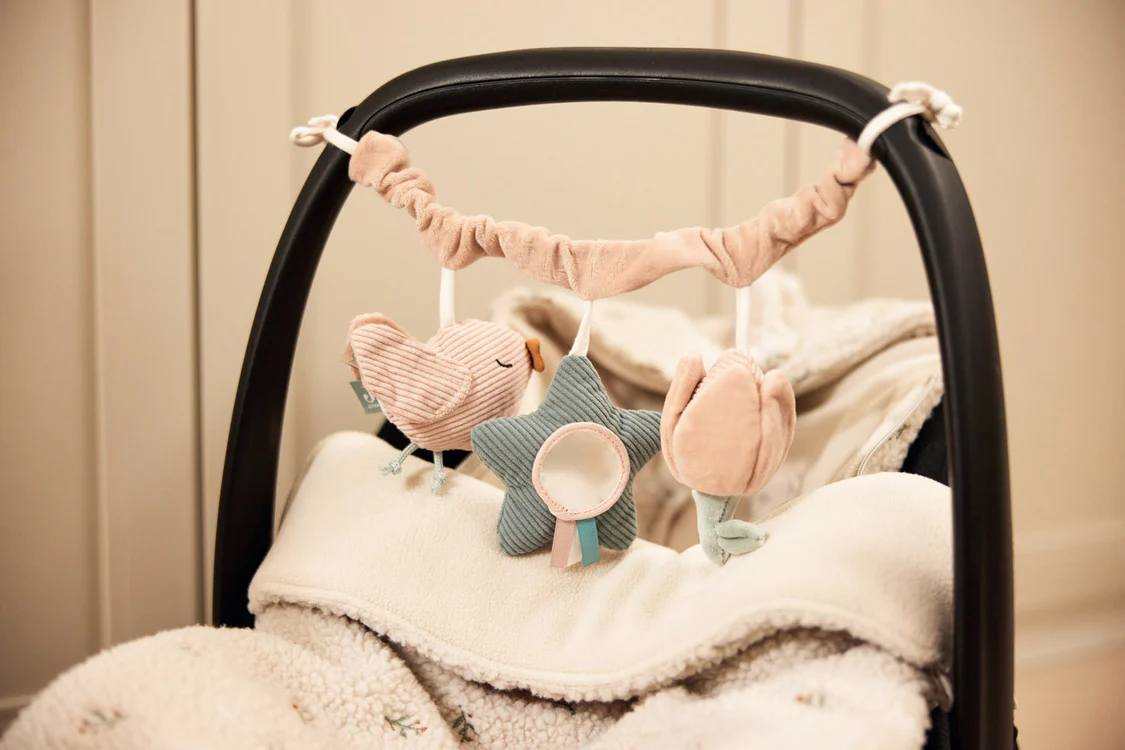 Vahvate pehmete mänguasjadega toode, mida saab kinnitada vankrile või turvahällile beebile vaatamiseks.