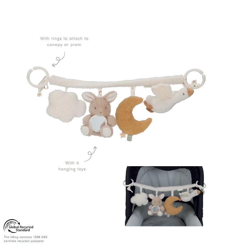Seda Little Dutch´i mänguasjade ketti on lihtne kinnitada vankri, käru või auto turvatooli külge. Mänguasjade kett pakub rohkelt rõõmu ja meelelahutust Teie lapsele tänu peeglile ja heli tekitavatele mänguasjadele. Armas jänku, pilveke, kuu ja haneke on siin, et teie jalutuskäigu ajal meelt lahutada. Samuti arendab see käte-silmade koordinatsiooni. Armas kaaslane rõõmsateks väljasõitudeks!