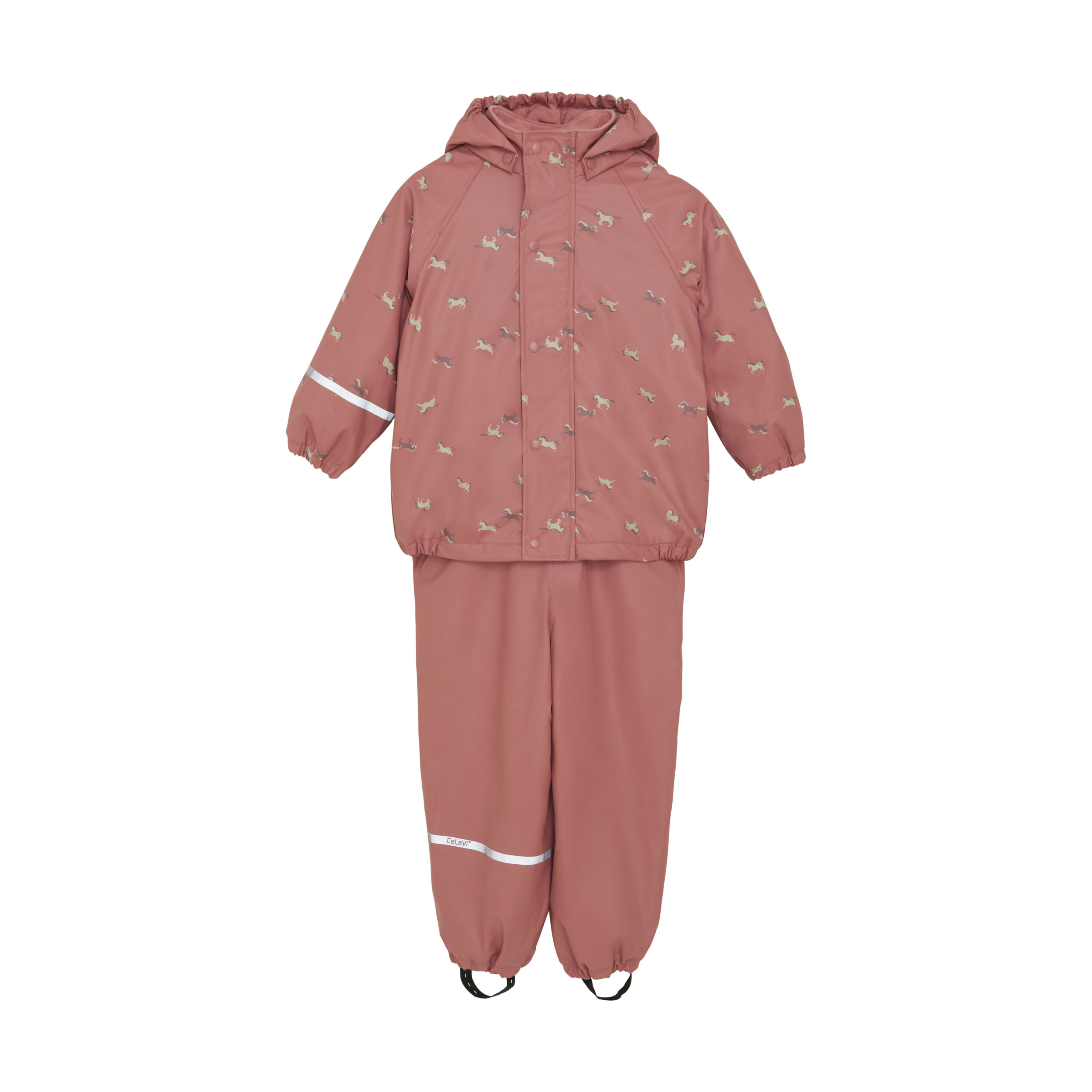 Valmistatud taaskasutatud polüestrist kummi-kattega. Vihmariided on veekindlad, testitud vastu pidama 10 000 mm vihma. Komplekt koosneb mustriga vihmajopest ja ühevärvilistest vihmapükstest. Kuni suuruseni 100 (kaasa arvatud) on vihmapüksid valmistatud reguleeritavate traksidega ja ees plastpandlaga. Neid saab küljelt praktiliste trukkidega sulgeda. Alates suurusest 110 on püksid valmistatud pükste moodi, vöökohal elastse kummiga. Mõlemal versioonil on reguleeritavad elastsed jalarihmad, mida saab saabaste alla panna, et need paigal püsiksid. Jopel on ees kvaliteetne lõuakaitse. Jope on lukuga, millest välimine kiht suletakse praktiliste trukkidega. Lõuakaitse tagab, et tõmblukk on lõua all pehme. Jopel on eemaldatav kapuuts ja varrukate otstes elastne kumm. Nii jopel kui ka pükstel on pehme fliisvooder ja helkurdetailid. Sees on nimesilt. Sertifitseeritud vastavalt standardile GRS-i järgi: valmistatud 51% ulatuses taaskasutatud materjalist CERES-0366.