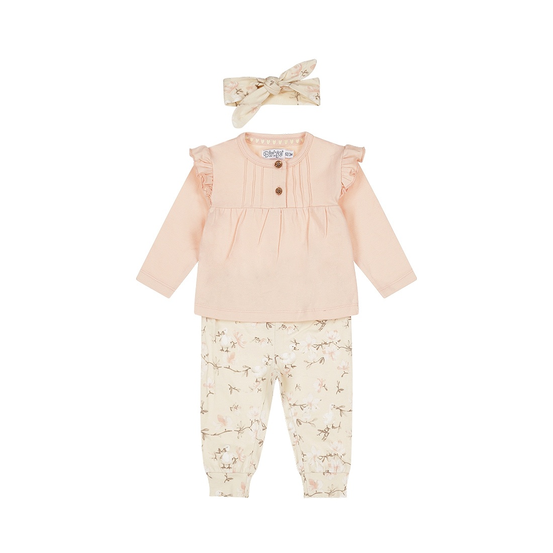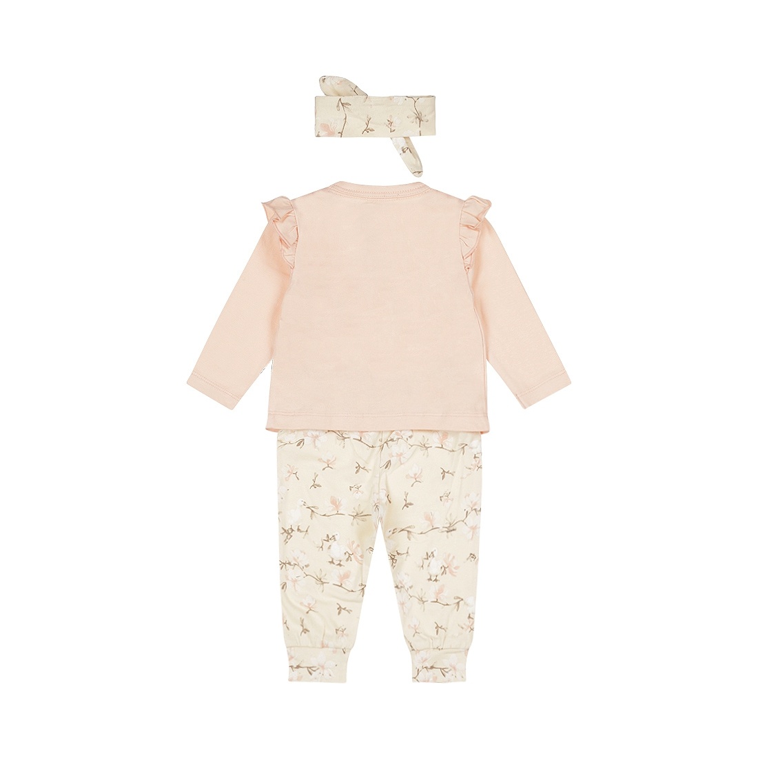 Beebide kolme osaline komplekt: pluus, püksid ja peapael.