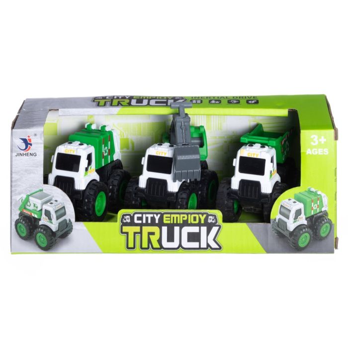 Mängukomplekt sisaldab kolme väikest plastmassist prügiautot liikuvate osade ja kummirehvidega. Soovitatav vanus 3+.