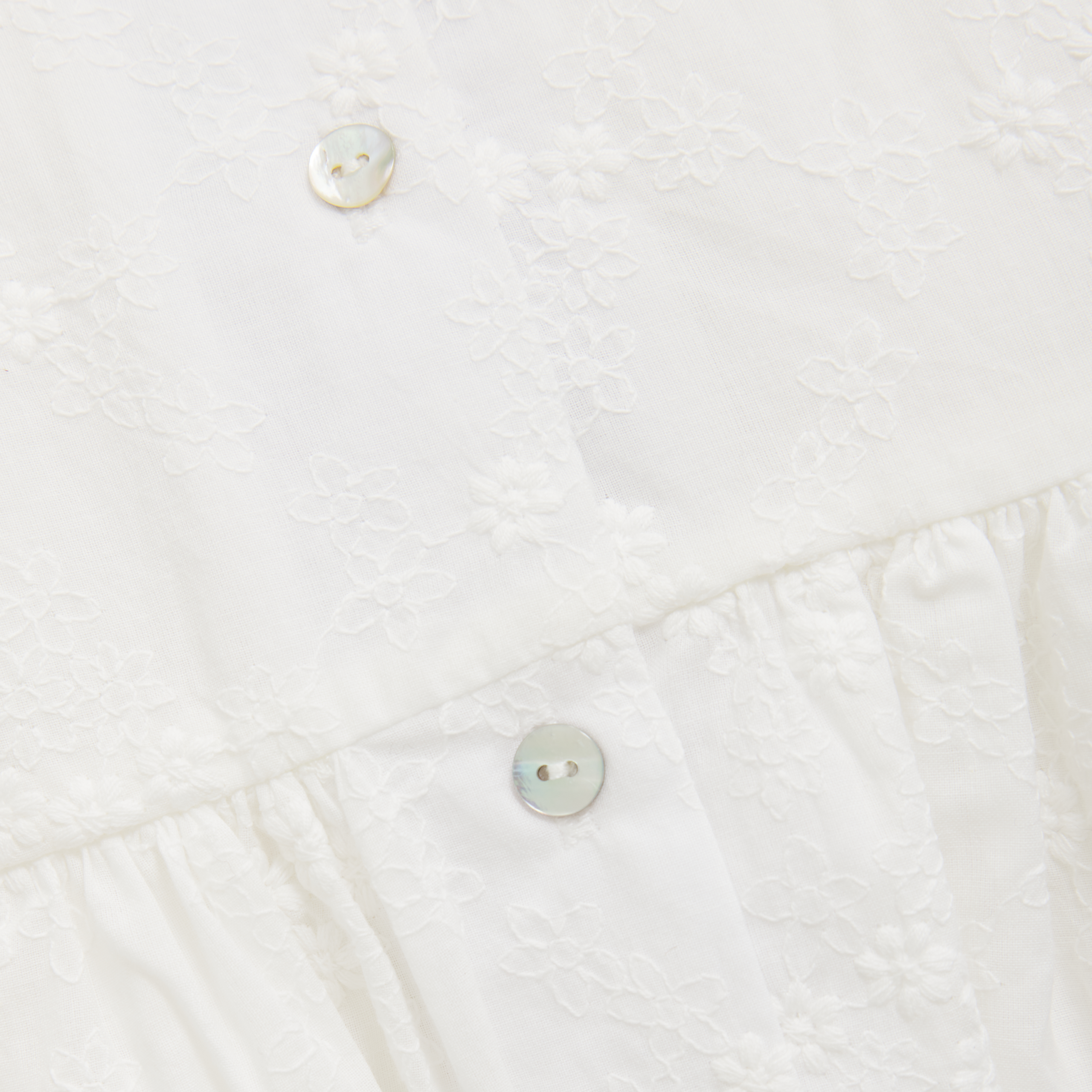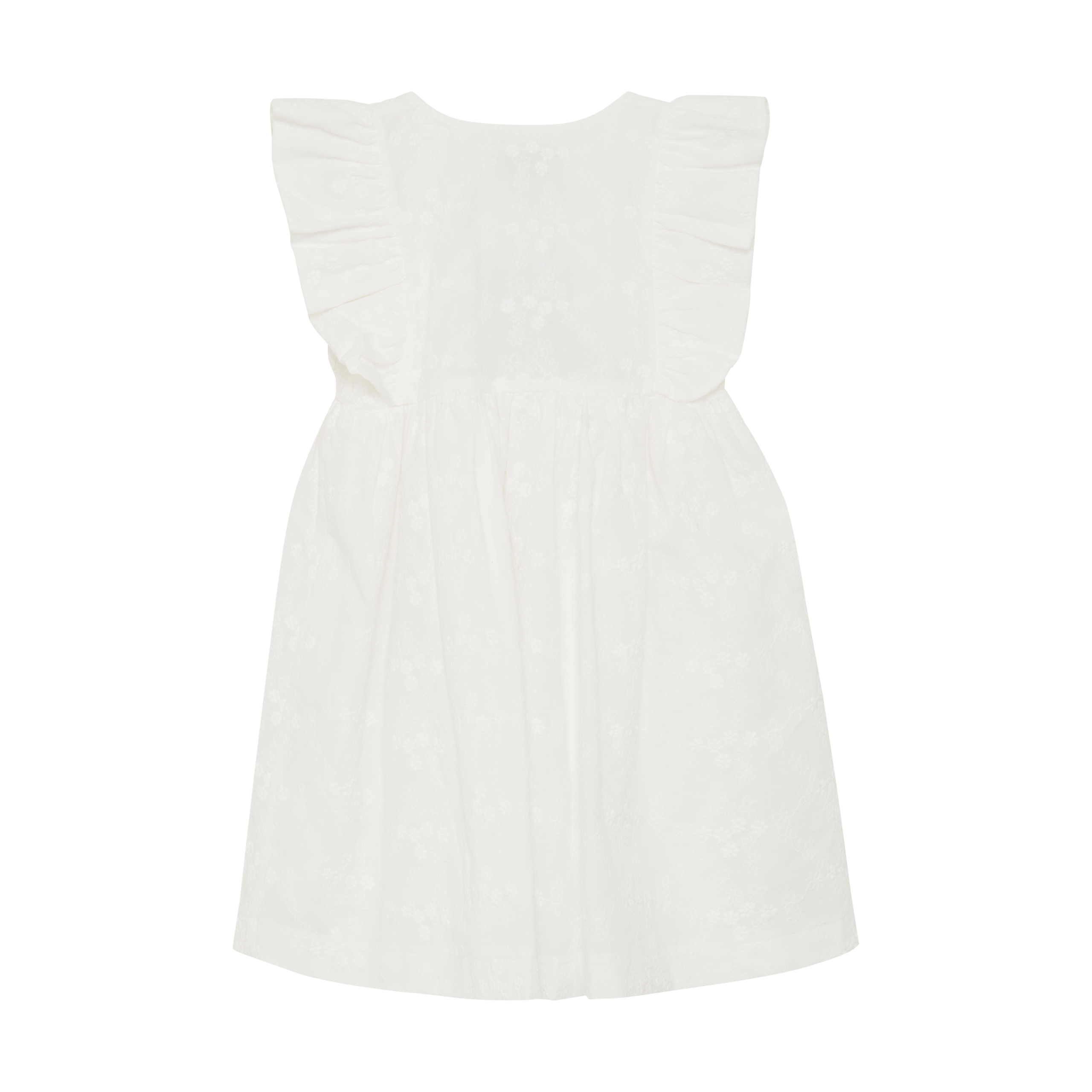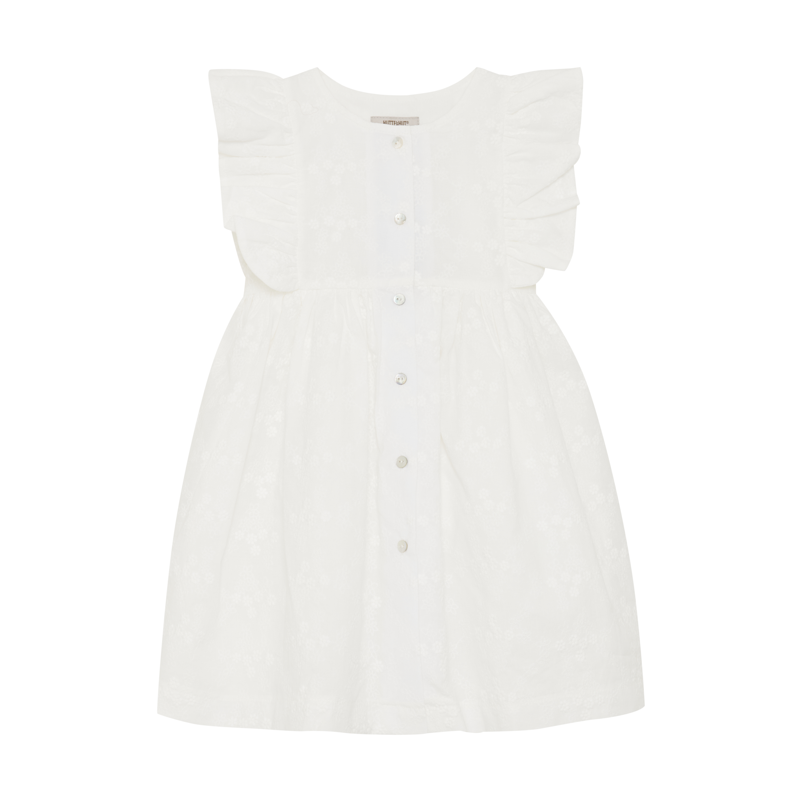 Armas valge tüdrukute suvekleit firmalt HUTTELiHUT. Kleidil on palju armsaid detaile ja ees nööpe ning vooder, nii et see ei paista läbi. Kleidil on tikandid ja varrukaava ümber on volangid. Sertifitseeritud vastavalt OEKO-TEX STANDARD 100 standardile.